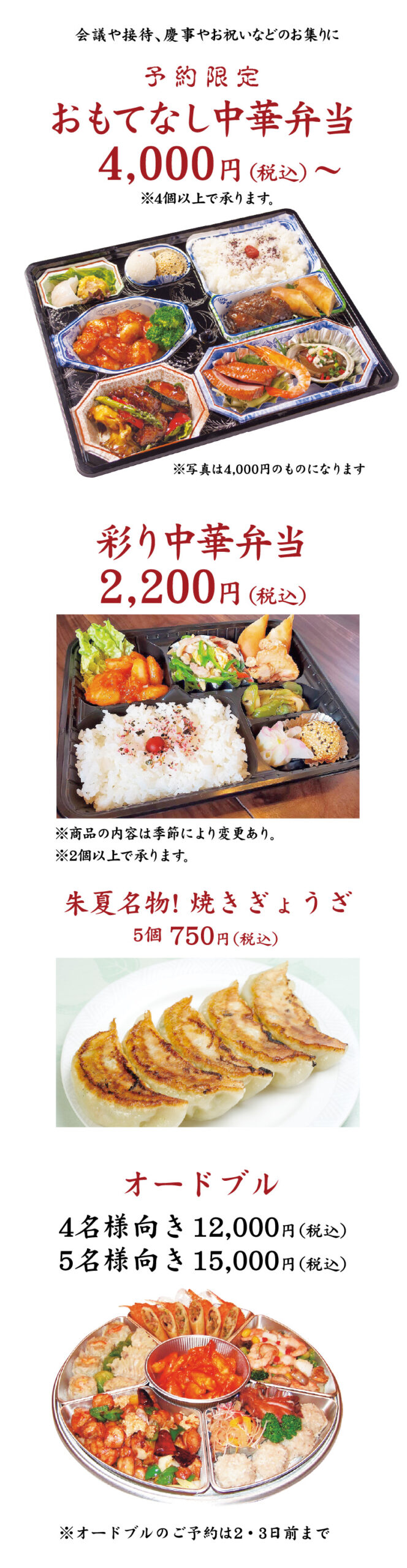 その他、お持ち帰りメニューも承ります。お問い合わせください。